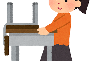 No.0056 床に水を撒いてモップ掛けをするため、椅子と机を片寄せた。