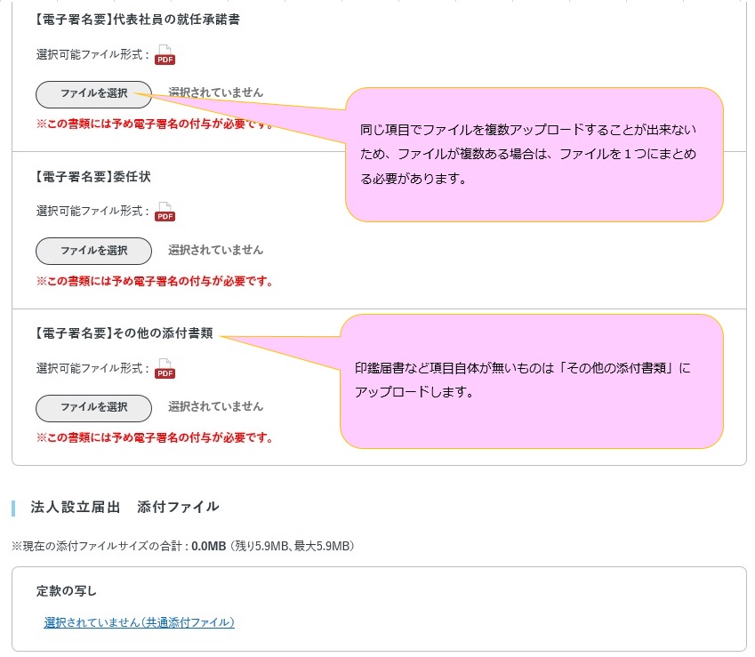 その他添付書類で困った点は、「払込みがあったことを証する書面」は、通帳の見開きページの画像ファイルも添付するつもりだったのですが、同一項目にはファイルが1つしかアップロードできなかったり、印鑑届書はアップロードする場所自体が用意されていなかったりと、細かいところで説明が足りないため、一発完了を目指していた僕にとっては迷いに迷いました。